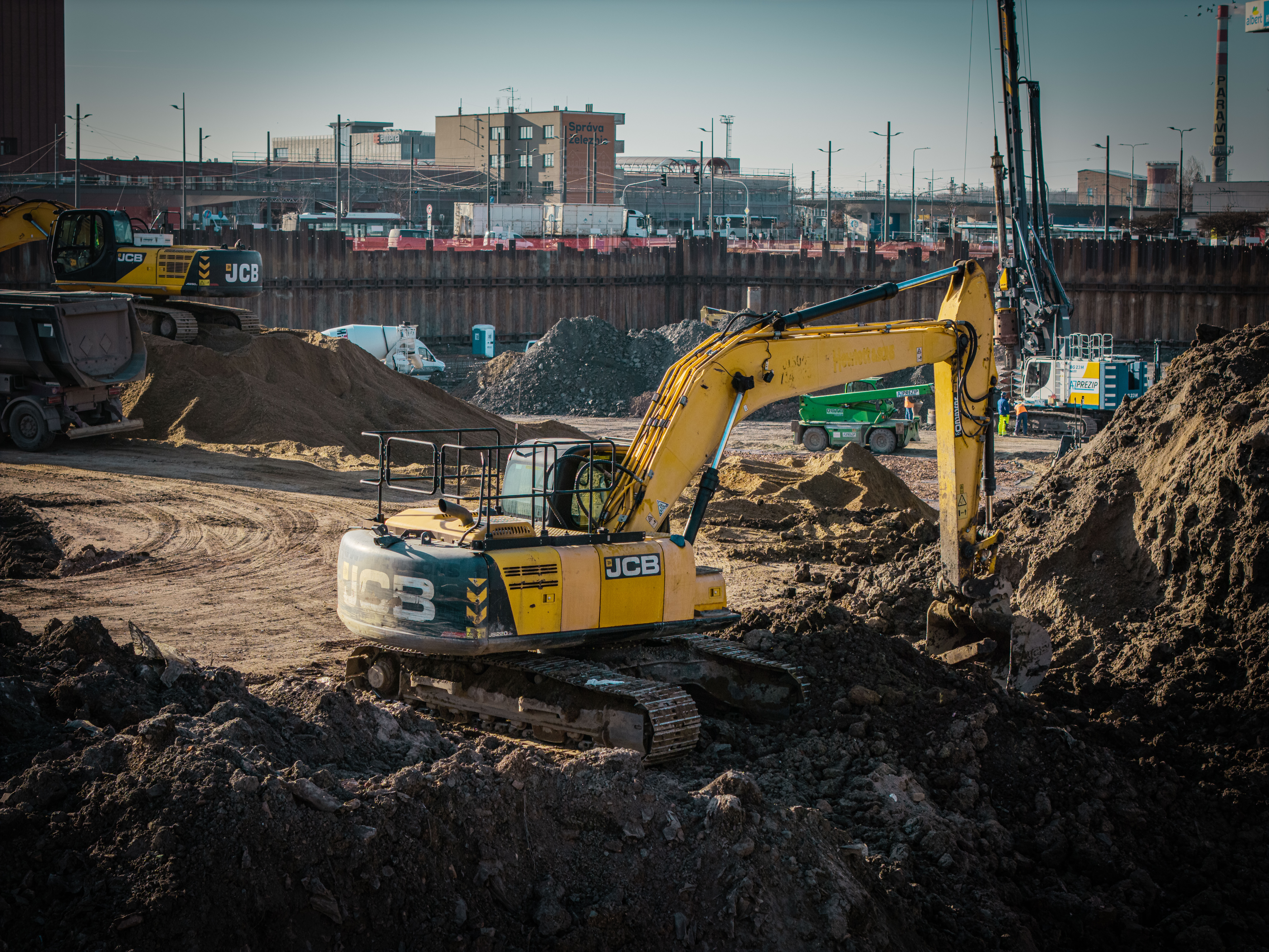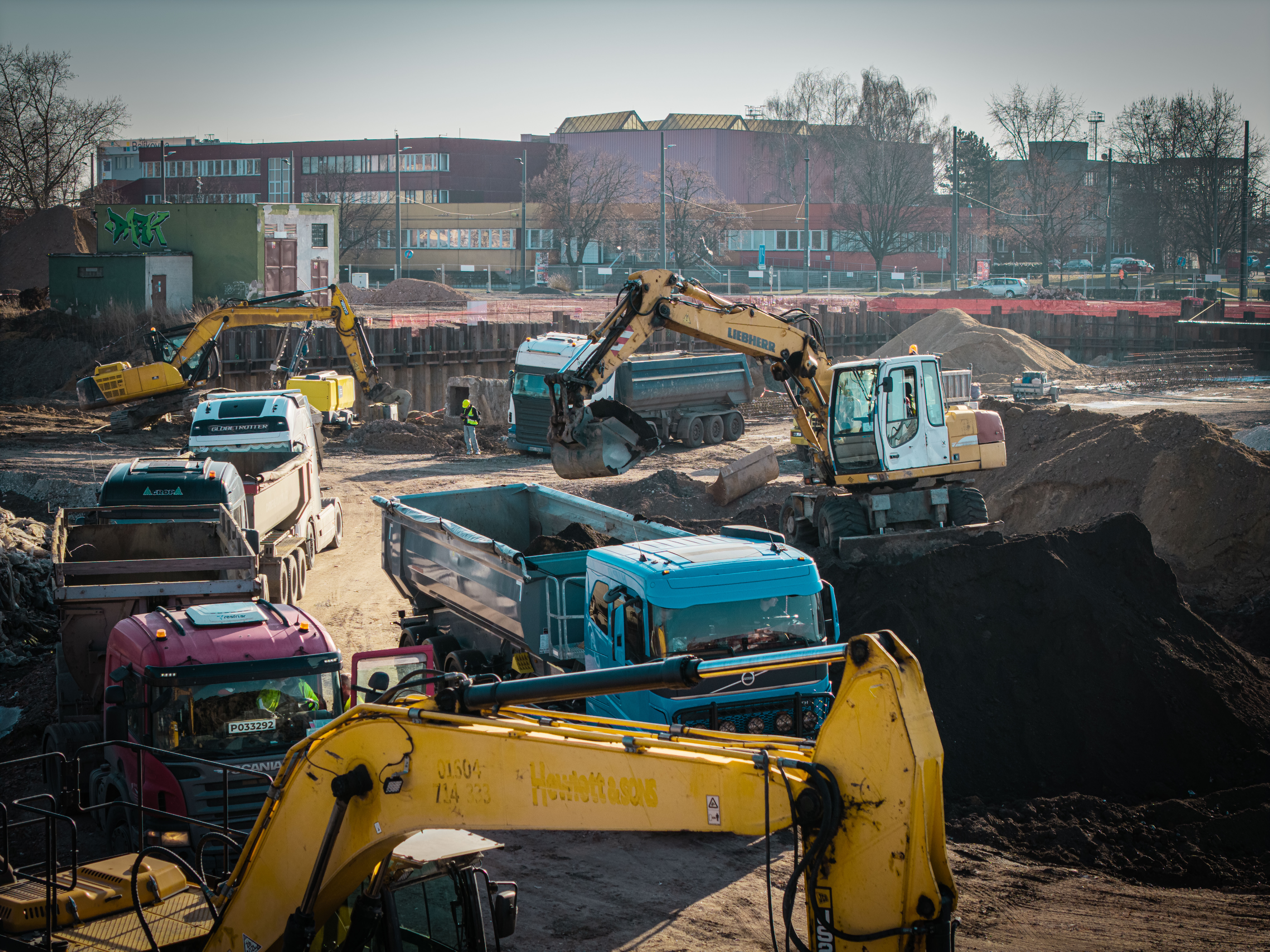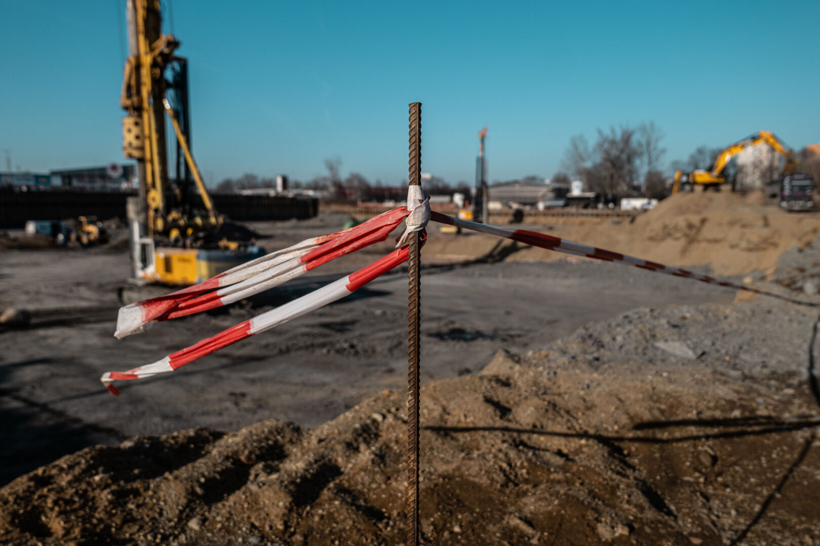 Velkou pozornost si nadále vyžaduje práce s podzemní vodou. V hlavní stavební jámě je v provozu všech dvacet studní, které pomáhají udržovat hladinu vody pod kontrolou a umožňují bezpečný postup dalších výkopů i betonáží. Na severní i jižní straně rampy probíhá zajištění jejích stěn. Pokračuje také zpevňování podloží v dalších částech staveniště a dokončování zakládání na pilotách – hotová je již více než polovina z plánovaných 618 pilot, které budou tvořit základ budoucí konstrukce. Současně se buduje areálová kanalizace. V této souvislosti byla instalována speciální lávka pro vedení kanalizace, která překonává výjezdovou rampu na východní straně staveniště.
