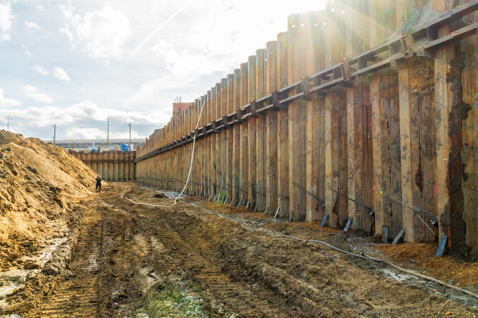 Během října společnost SYNER připravovala stavební jámu pro piloty, kotvila štětovnice po jejích okrajích a kvůli čerpání podzemní vody vytvořila také řadu studní. Z východní strany vznikla vjezdová rampa a stavebníci provedli montáž ochranného zábradlí kolem stavební jámy.